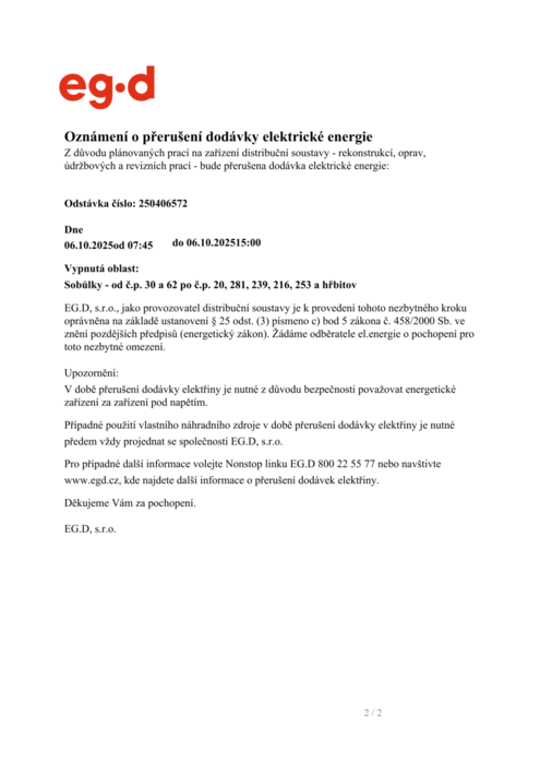 Úvod > Dění v obci > Aktuality > OZNÁMENÍ O PŘERUŠENÍ DODÁVKY ELEKTRICKÉ ENERGIE 6.10.2025