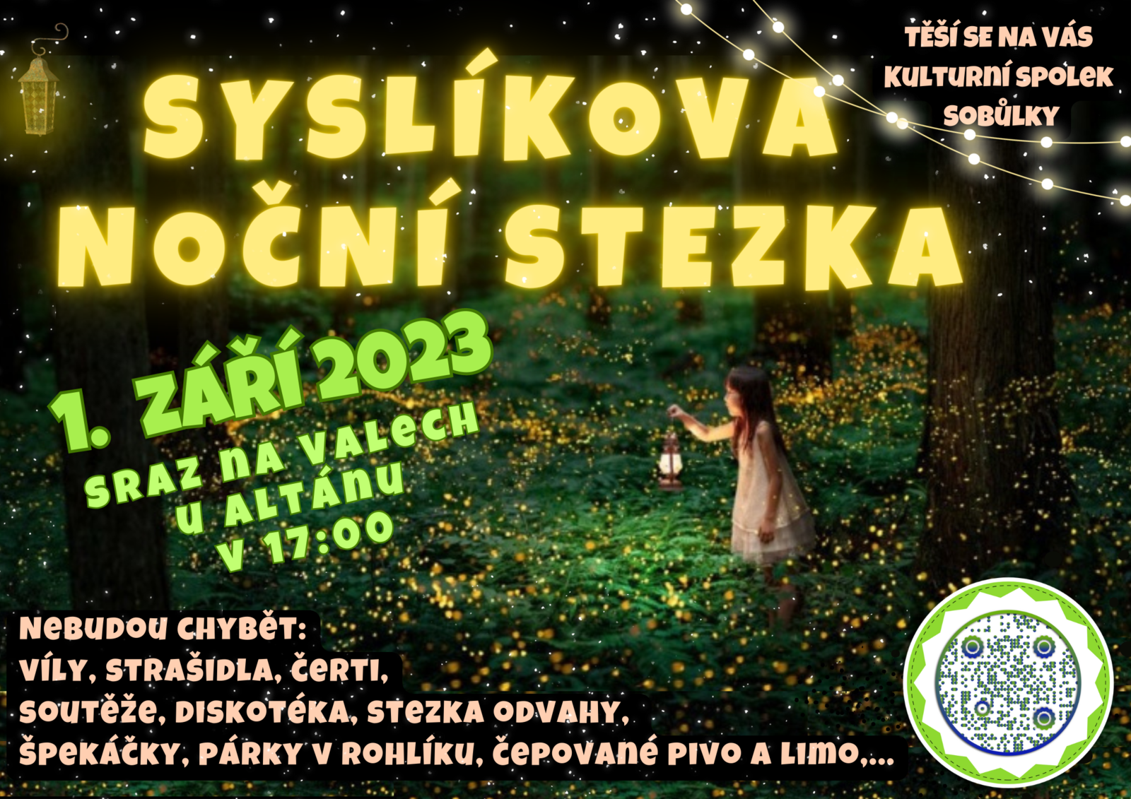 Kulturní spolek Sobůlky dává s radostí na vědomí, že Syslíkova noční stezka není zrušena, ale je přesunuta na pátek 1.9.2023 Začátek akce je v 17:00 Sraz na vyznačeném bodu - Na Valech (Hřiště na Syslíkově stezce) Akce se koná i za lehce nepříznivého počasí Dětem doporučujeme vzít s sebou baterky a pláštěnky. Těšit se můžete na soutěže s Mankou a Rumcajsem, diskotéku s vílami a strašidly, opékání buřtů s čerty, stezku odvahy se světluškou, jezinkami a dalšími lesními tvory... V bufetu bude připraveno i čepované pivo a limo, hotdogy a další dobroty.