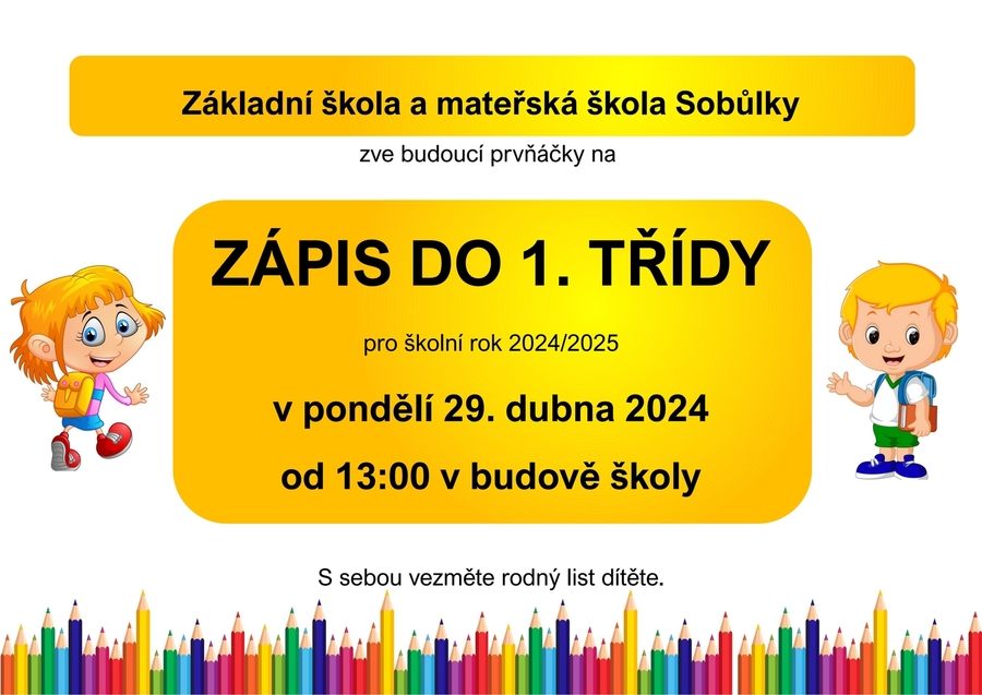 Úvod > Dění v obci > Aktuality > Zápis do PRVNÍ TŘÍDY ZŠ Sobůlky 2024/2025
